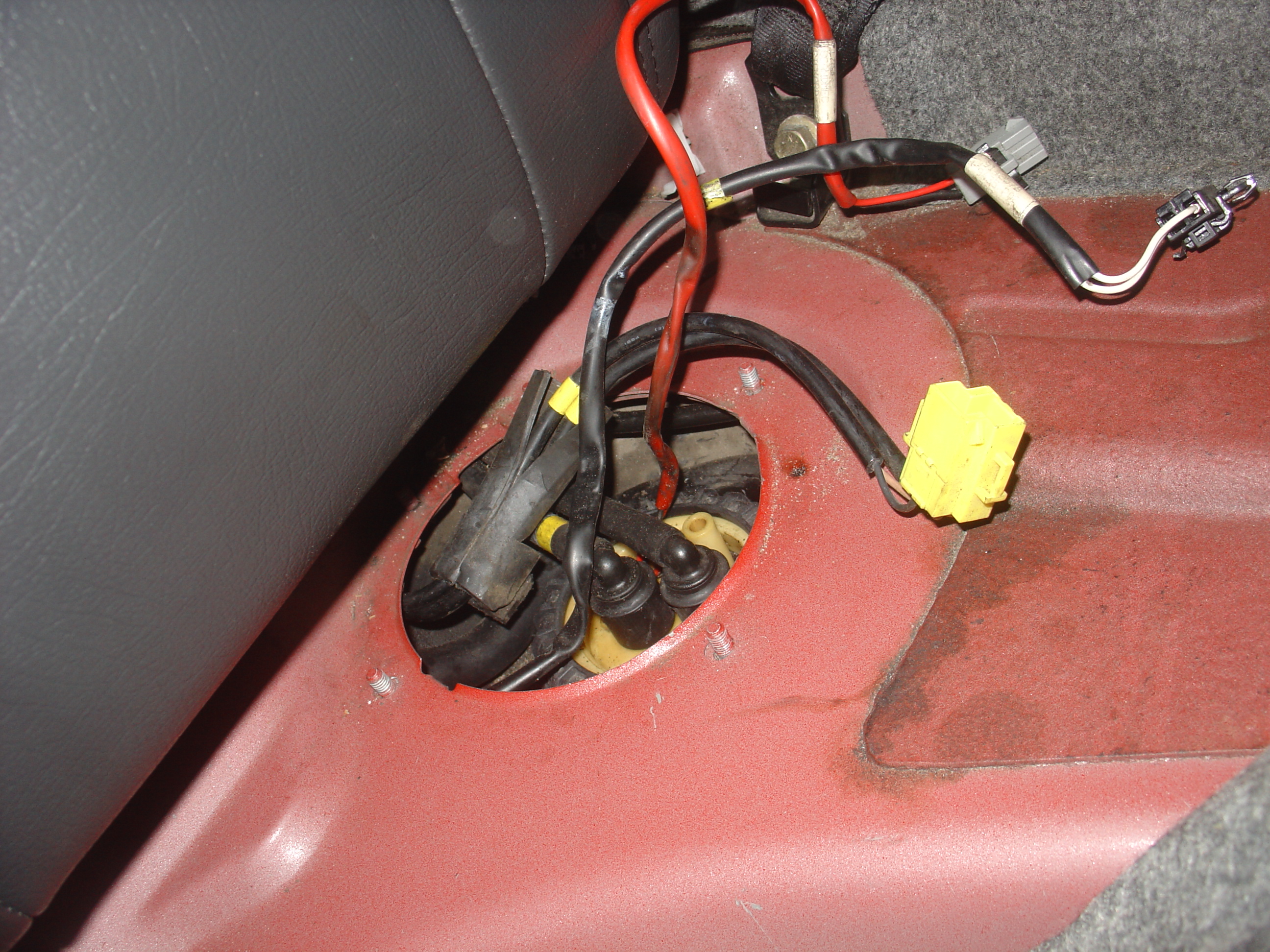 OK so first we removed the rear bench seat and push into place the rear bench seat, this gives as access enough to unbolt the 5 nuts holding down the cover. We then unclip the 3 looms that feed the fuel pump, sender unit and pressure sensor? These looms must be disconnected before the bolts can be undone to drop the tank.