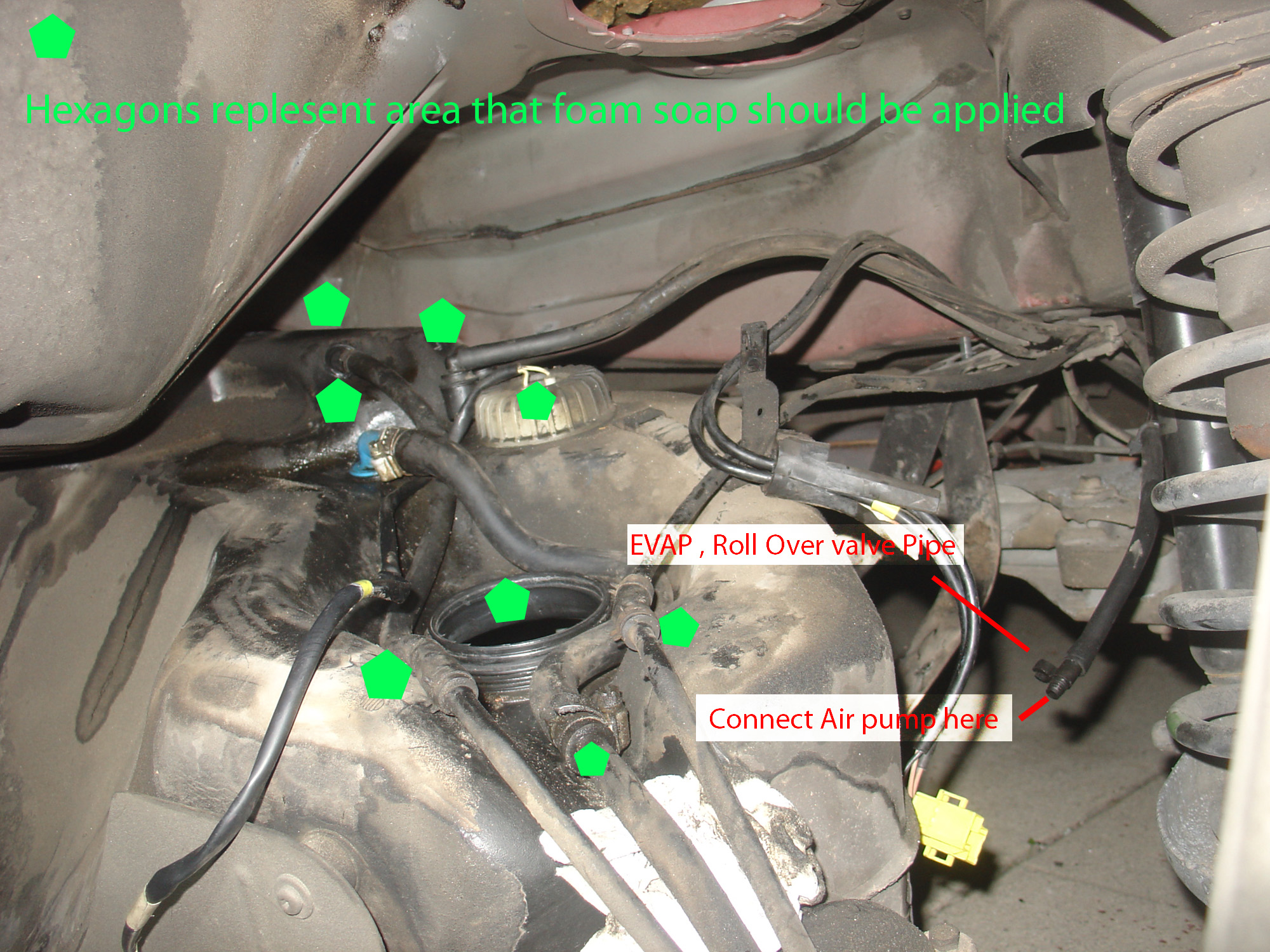 I was not able to take a picture of this stage because I made a Royal frigging mess! I was not about to touch the camera with my oil foam stained hands! The important part for testing leaks is using the EVAP hose that connects to the roll over valve. I disconnected this pipe and connected it to a bicycle pump and slowly began to push air into the tank. In this picture the pump has already been removed so imagine its still in there.