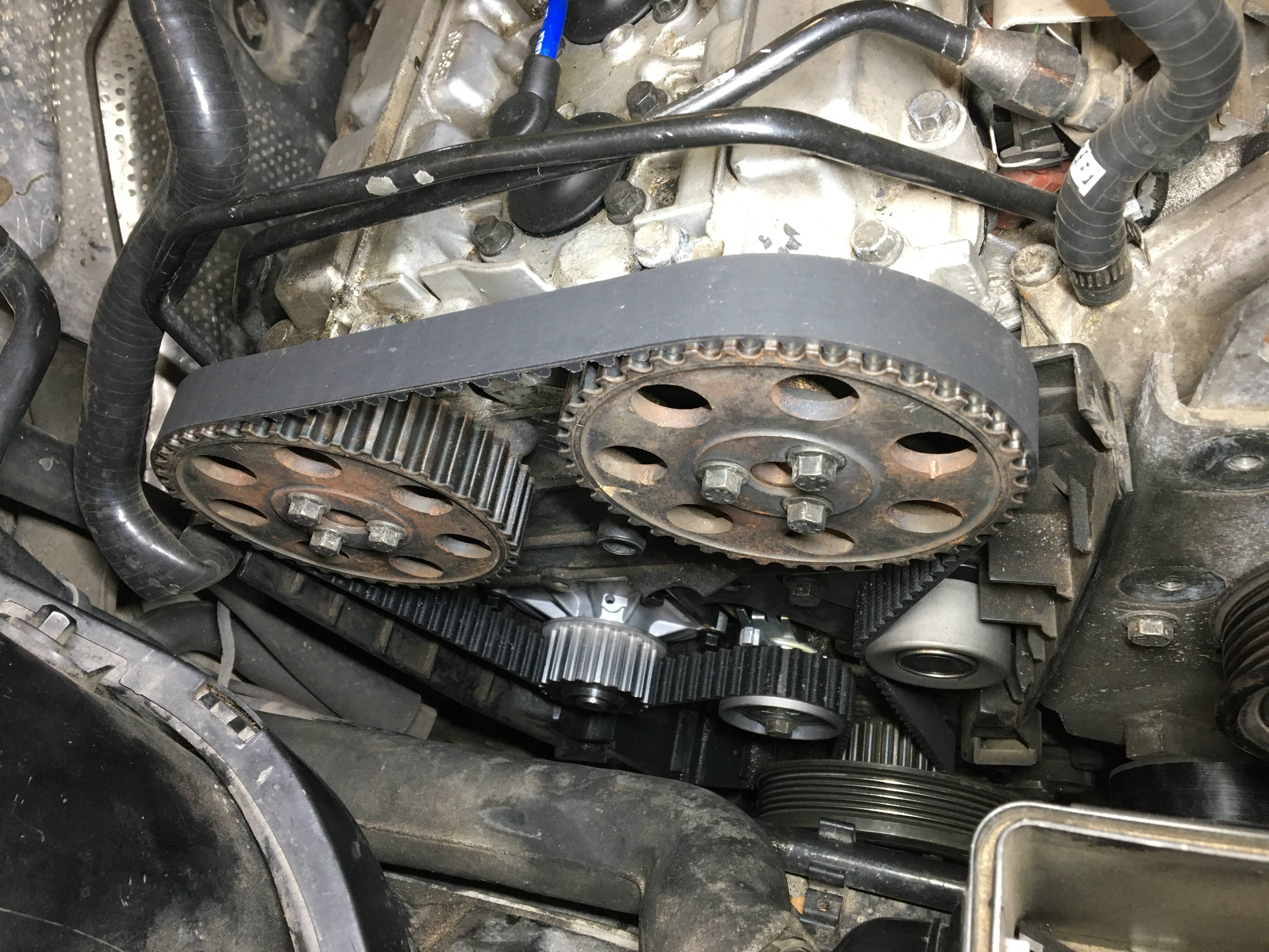 So onto the build… it’s a bone stock 1998 V70 GLT. 2.4L LPT N motor, 13G turbo. I started by replacing the timing belt, tensioner, idler, and water pump the other day, and just last night I got the 19T mounted up with the original straight flange exhaust housing. Yes, an angled flange would flow better, but we’re going to stick with the straight flange for now to work with an OBX downpipe.