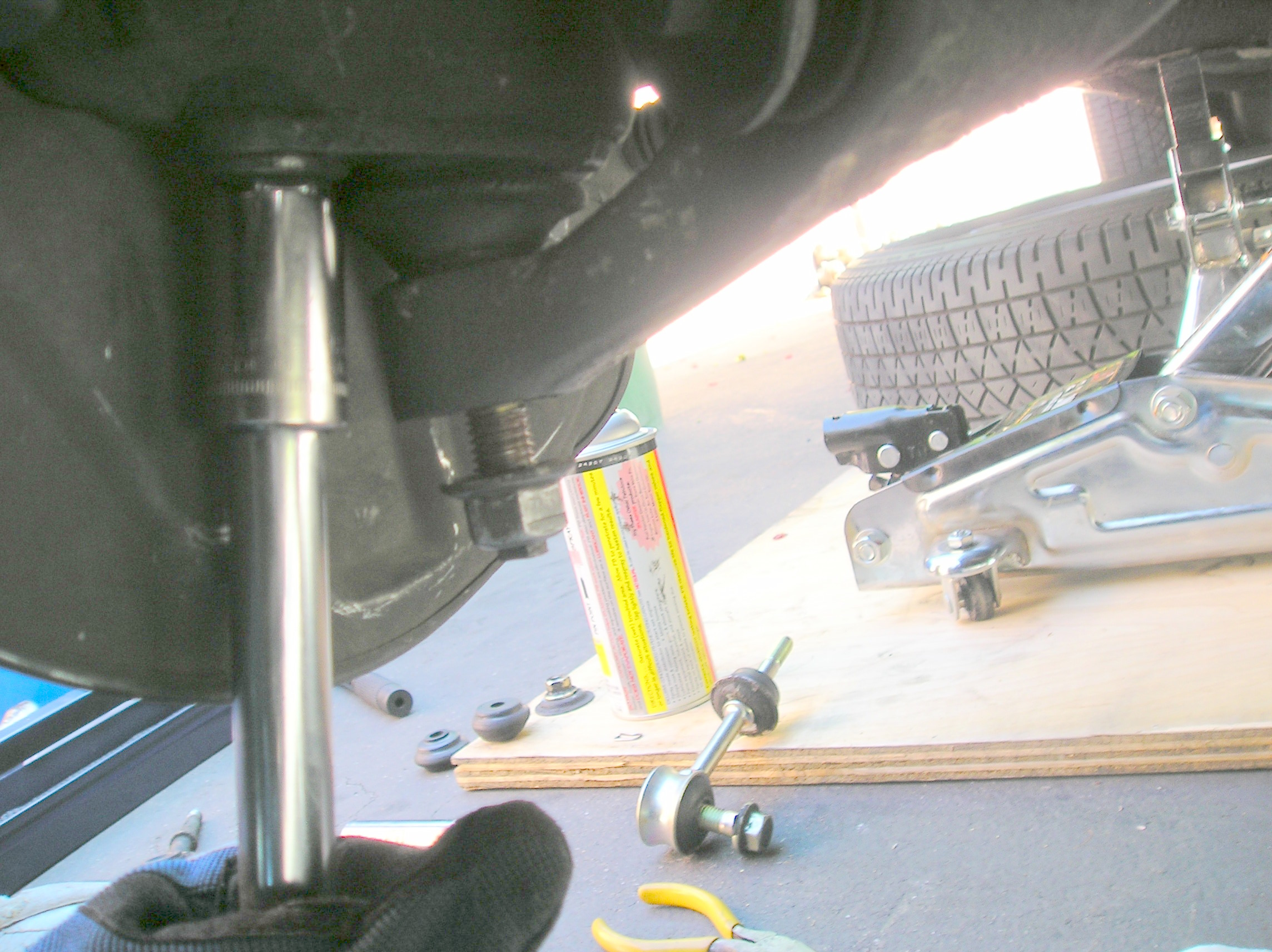 7. Now on to the sway bar end links. There’s more than one way to install them. What worked best for me was to thread the new one into the sway bar, bolt the bottom bolt, add the top bushing and washer, then use the ever useful pry bar to press down on the sway bar enough to get the top nut threaded. Use thread locker. The bottom bolt is torqued to gutantight standards; the top bushings are compressed to approximately 42 mm from washer to washer. Reinstall the wheel to torque specifications.