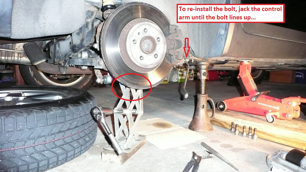 As mentioned above. Raise the control arm (watch exactly where to place the jack, it can slip any time!) to allow you to insert the 15-mm bolt. Tighten this bolt ONLY after the car is back on the ground.