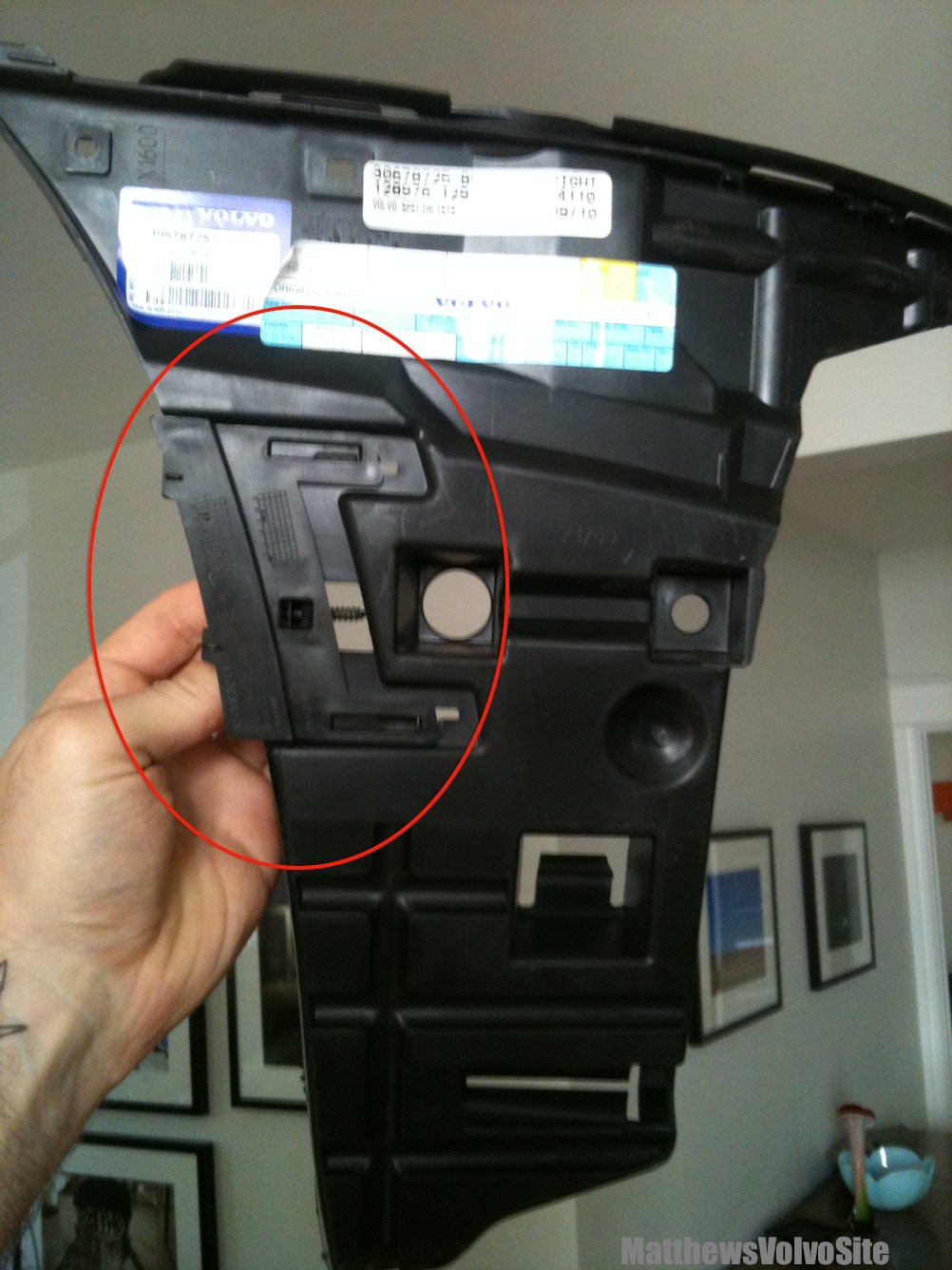 - Pull the bumper back so that the tabs of the piece circled in the photos “catches” the catch in the bumper. The tabs (arrowed) will find their place on the bumper.