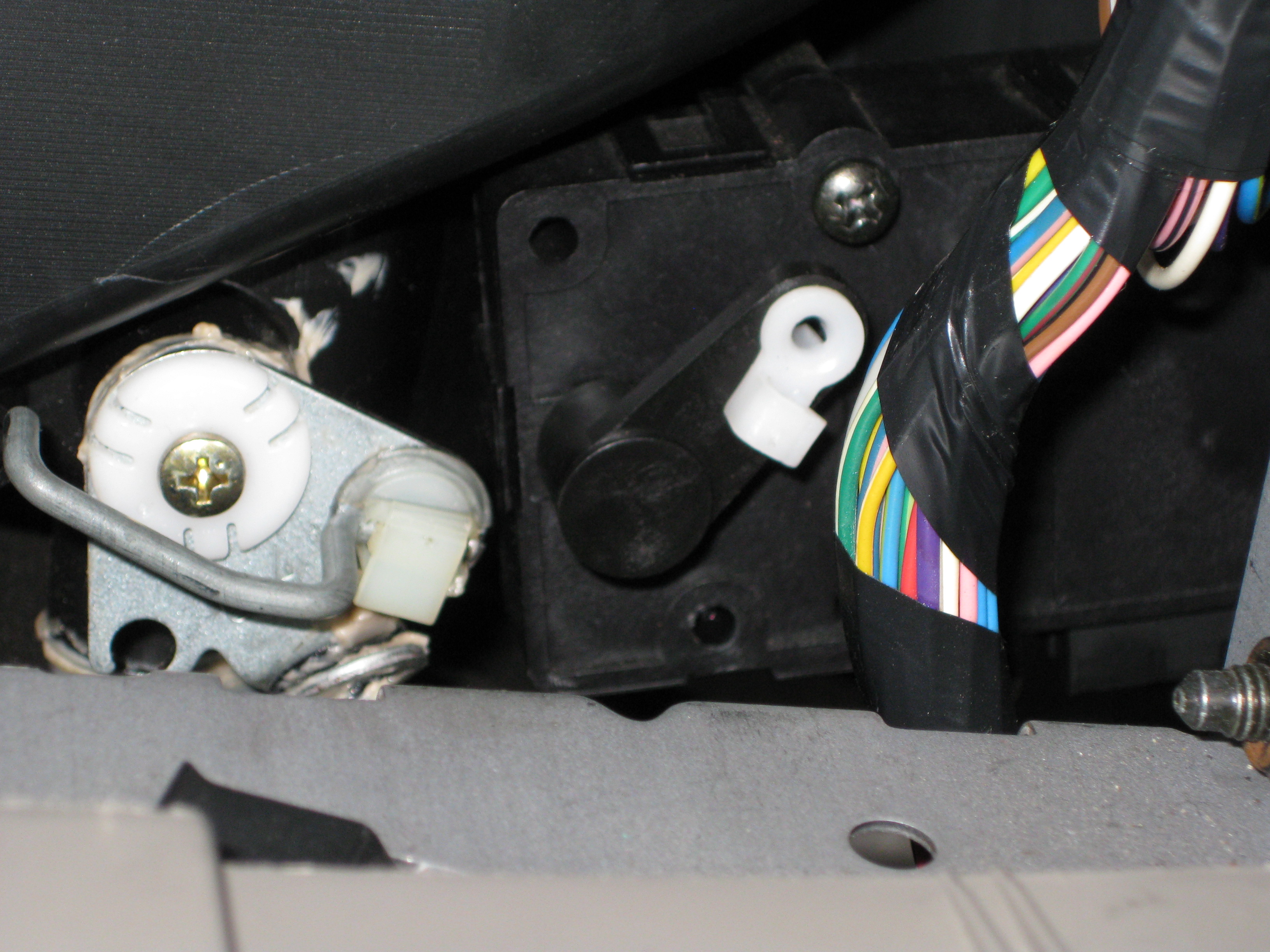 drvolvo » My damper motor stopped responding to changes in the temperature dial, leaving me with a car that was either 100% on full heat or 100% on cold. Eventually I disconnected the damper motor arm so that I could just change the damper myself manually. This was a pain though, since I’d have to remove the radio to access the damper arm.Here is a picture of the damper motor with the arm removed. This is visible once you remove the radio.If you also remove the side panel on the passenger side foot well, you can access the damper motor for removal. You also have to remove the wires that unclip easily from the back of the damper motor.