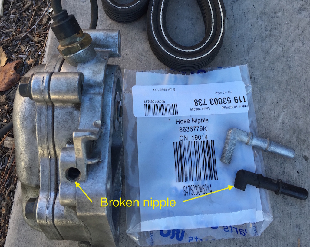 So my project was stopped cold when the 90 degree nipple broke. I was able to find a metal replacement from my local auto parts store! It was a URO part #8636779K. The parts store charged me $31, but you can find it online at IPD or FCPEuro for half that. In the picture below you can see the broken black plastic piece with part of it still inside the housing.